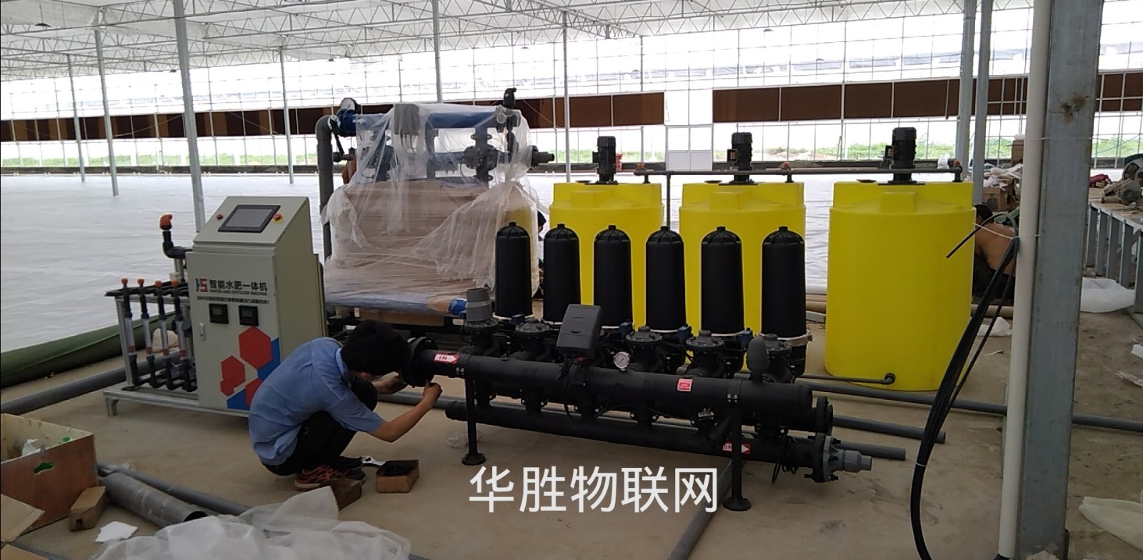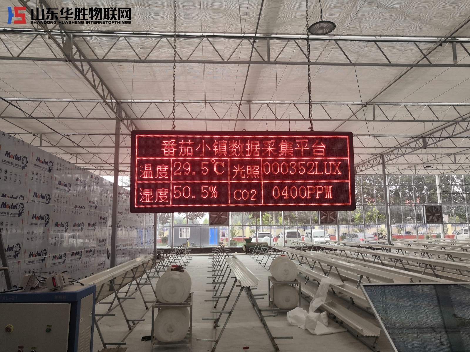 壽光番茄小鎮(zhèn)玻璃溫室采用華勝物聯(lián)網(wǎng)智能水肥一體機(jī)實(shí)現(xiàn)智能化灌溉,同時(shí)應(yīng)用了傳感器監(jiān)測(cè)數(shù)據(jù),LED顯示屏直觀看數(shù)據(jù)。