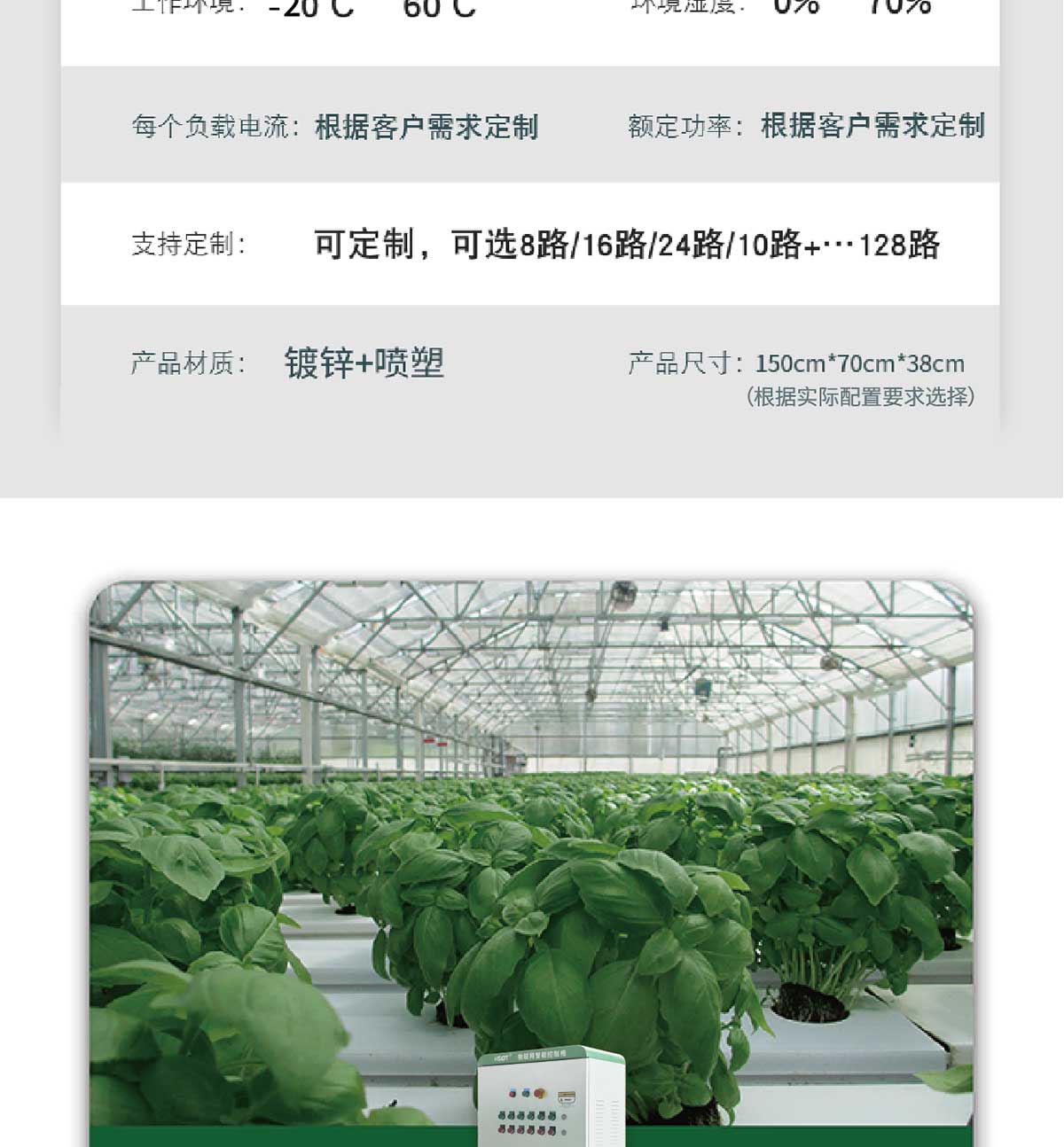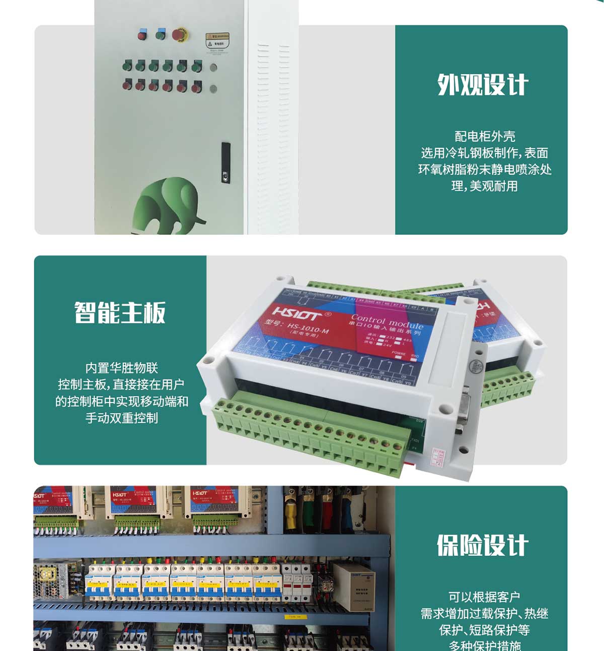 產(chǎn)品簡介 : 華勝物聯(lián)網(wǎng)智能控制柜實(shí)現(xiàn)了運(yùn)用手機(jī)微信小程序綁定賬戶就可以遠(yuǎn)程控制溫室中的設(shè)備運(yùn)作,控制柜采用標(biāo)準(zhǔn)化生產(chǎn)線,設(shè)計(jì)、布局、安裝、走線等流程簡明、精準(zhǔn),可根據(jù)客戶的需求添加電路保護(hù)措施,如過載保護(hù)、熱繼保護(hù)等多種保護(hù)措施,防止電路危險(xiǎn)的發(fā)生,在用電安全上做到了防患于未然。