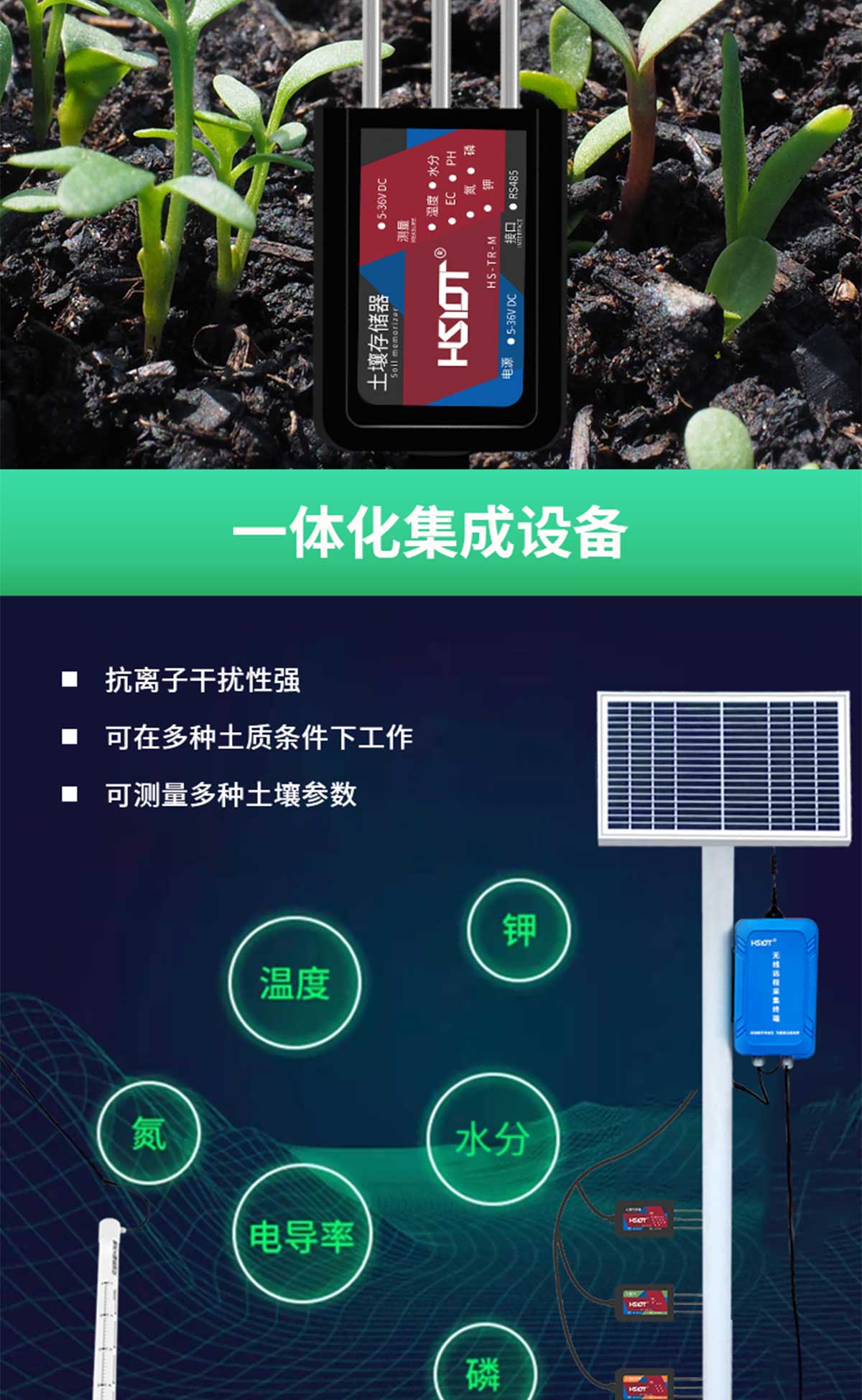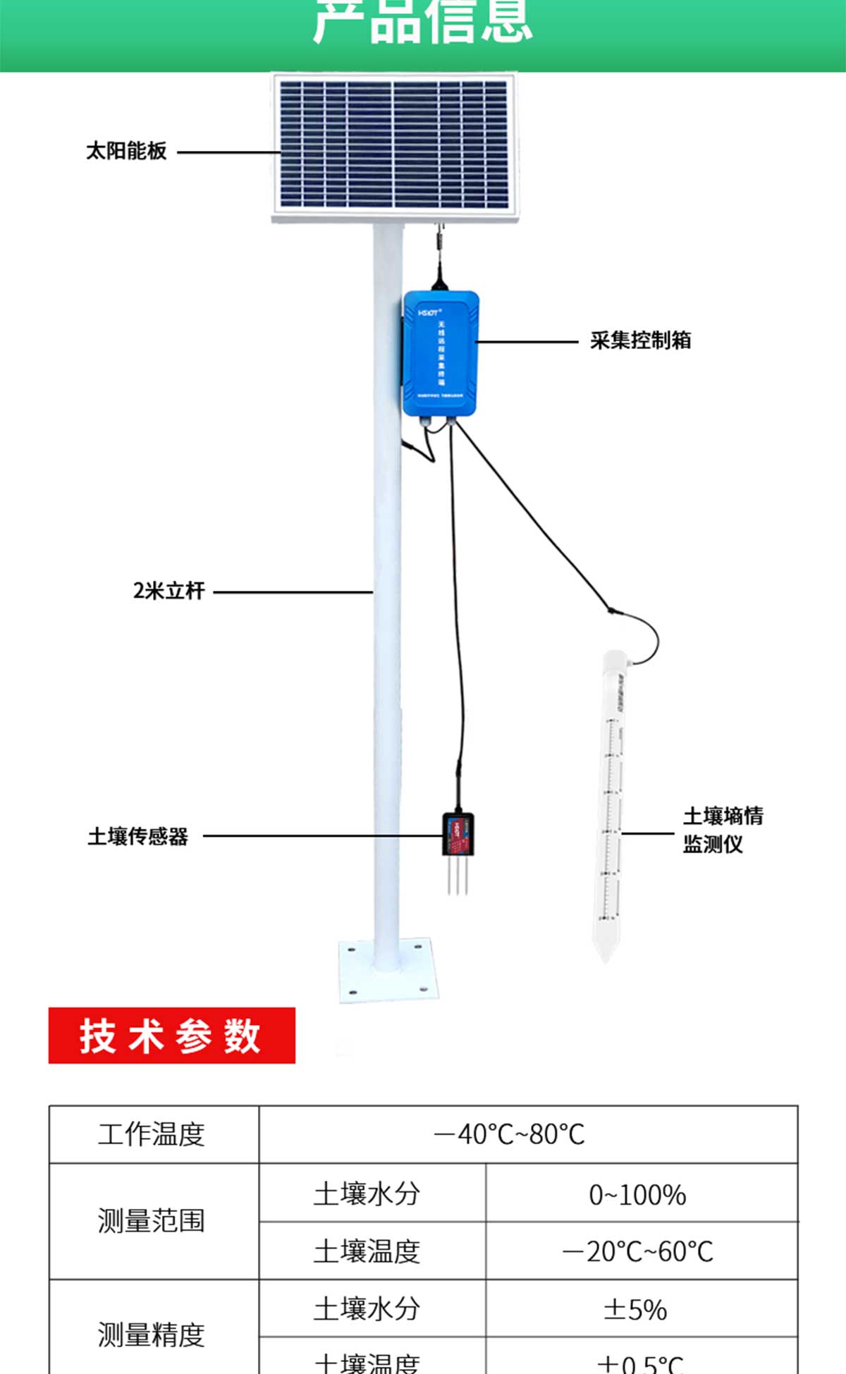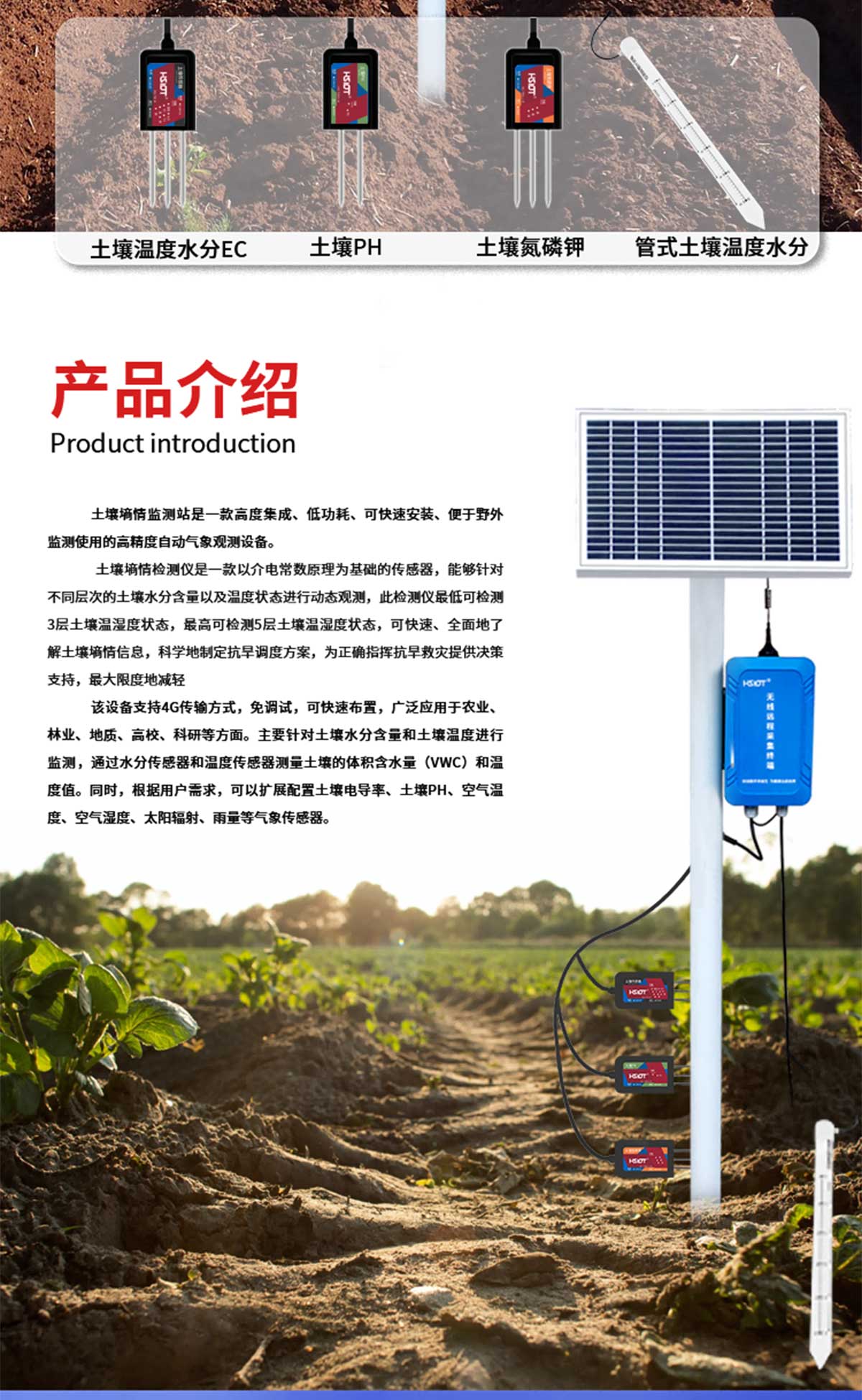 產(chǎn)品簡介 : 土壤墑情監(jiān)測站是一款高度集成、低功耗、可快速安裝、便于野外監(jiān)測使用的高精度自動氣象觀測設(shè)備。 該設(shè)備支持4G傳輸方式,免調(diào)試,可快速布置,廣泛應(yīng)用于農(nóng)業(yè)、林業(yè)、地質(zhì)、高校、科研等方面。主要針對土壤水分含量和土壤溫度進(jìn)行監(jiān)測,通過水分傳感器和溫度傳感器測量土壤的體積含水量(VWC)和溫度值。同時,根據(jù)用戶需求,可以擴(kuò)展配置土壤電導(dǎo)率、土壤PH、空氣溫度、空氣濕度、太陽輻射、雨量等氣象傳感器。