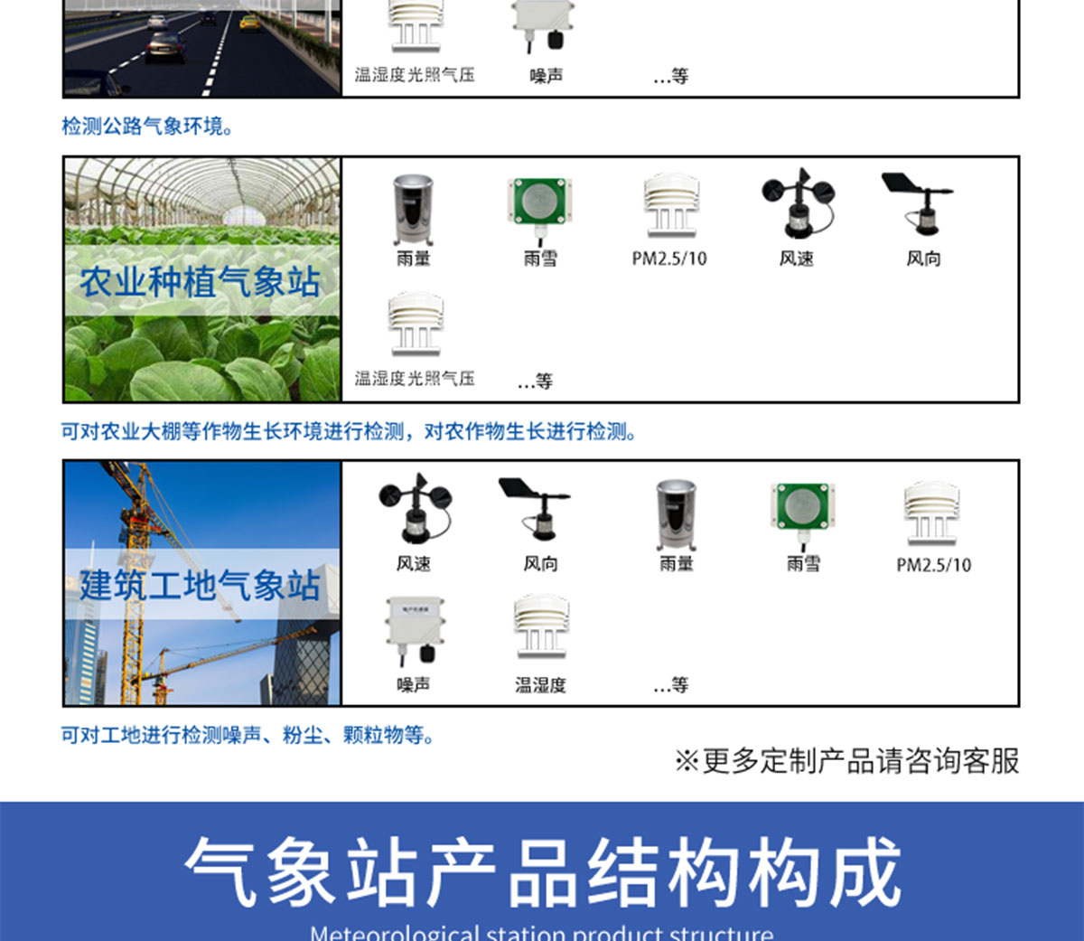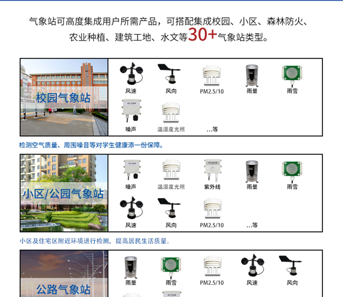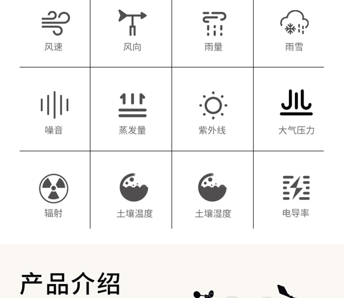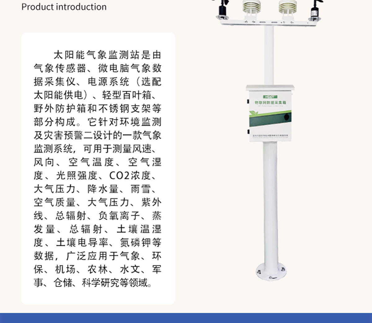 產(chǎn)品簡介 : 室外環(huán)境氣象站是由氣象傳感器、微電腦氣象數(shù)據(jù)采集儀、電源系統(tǒng)(選配太陽能供電)、輕型百葉箱、野外防護箱和不銹鋼支架等部分構成。它針對環(huán)境監(jiān)測及災害預警二設計的一款氣象監(jiān)測系統(tǒng),可用于測量風速、風向、空氣溫度、空氣濕度、光照強度、CO2濃度、大氣壓力、降水量、雨雪、空氣質量、大氣壓力、紫外線、總輻射、負氧離子、蒸發(fā)量、總輻射、土壤溫濕度、土壤電導率、氮磷鉀等數(shù)據(jù)。
