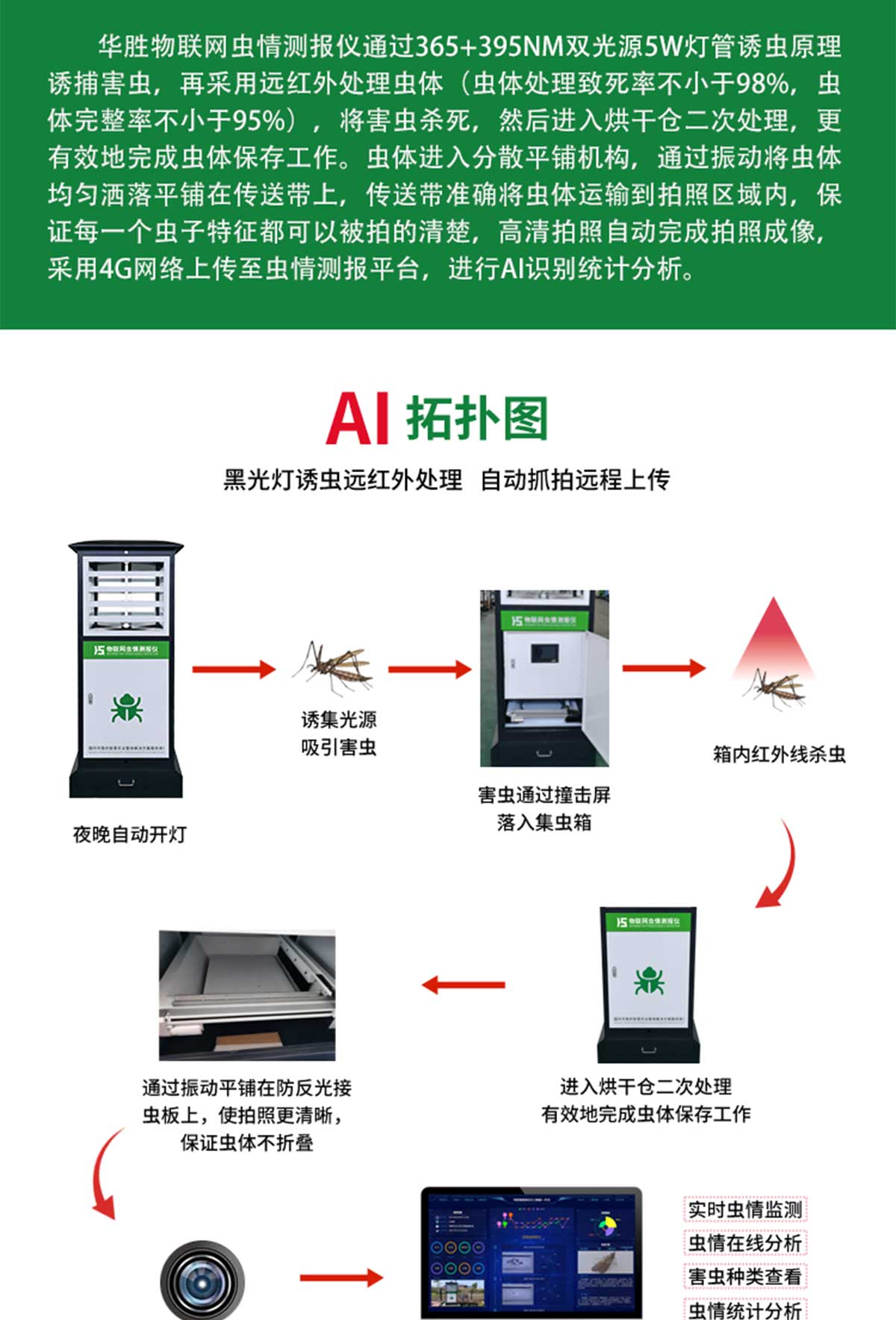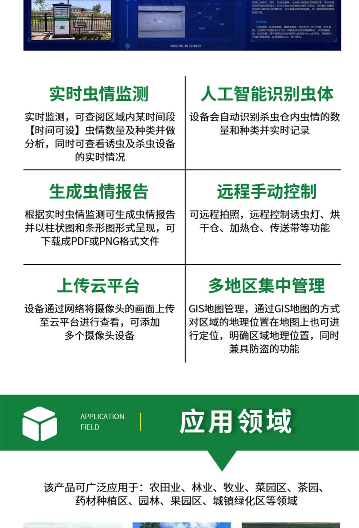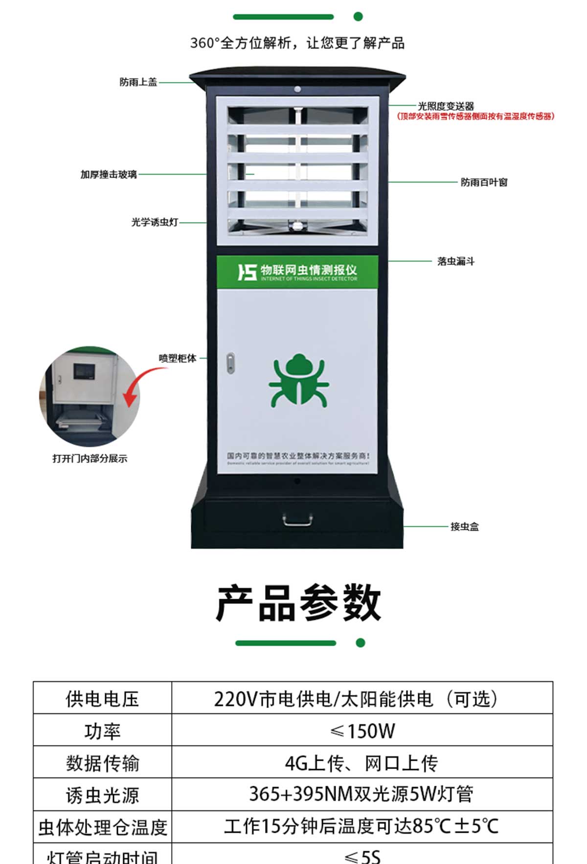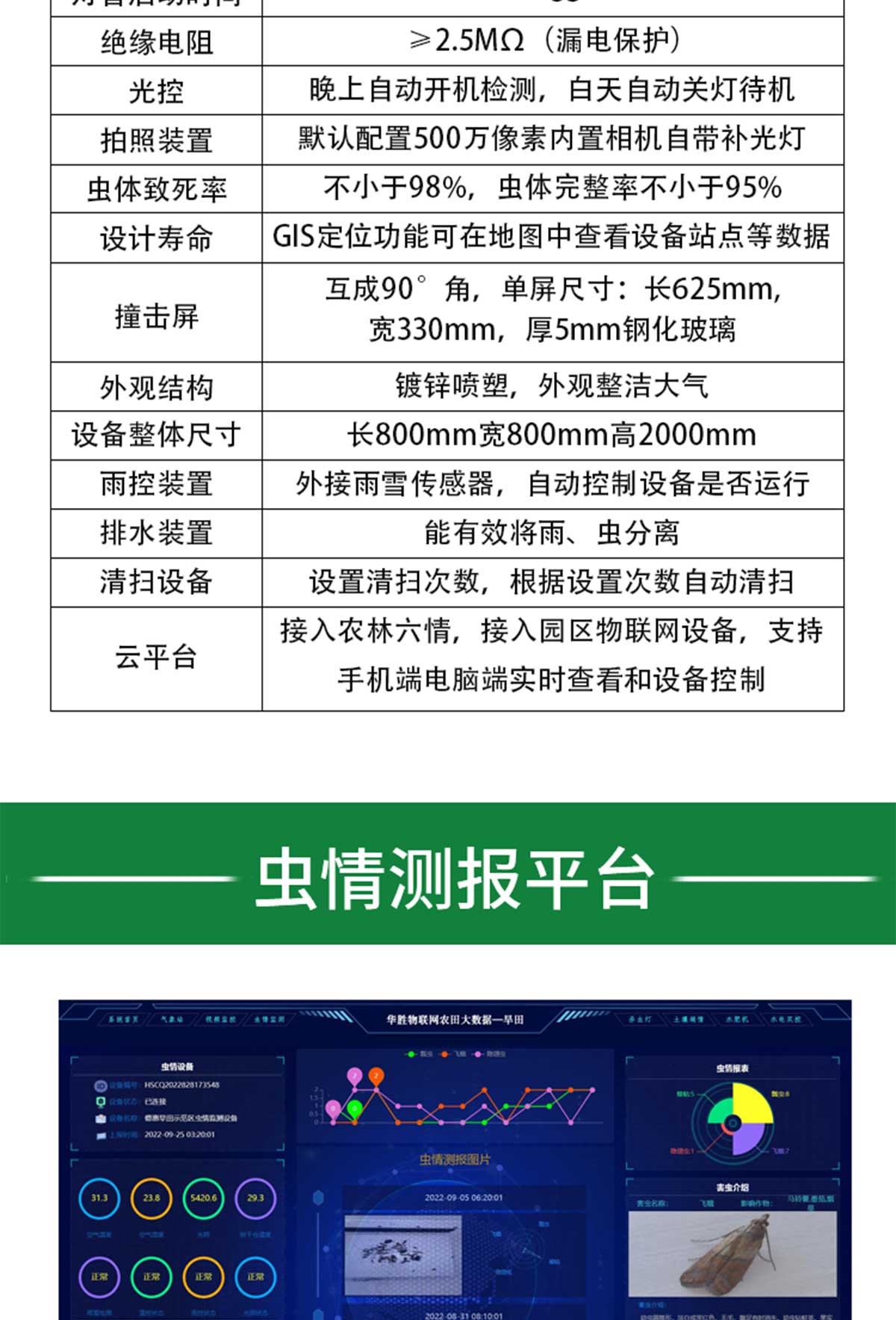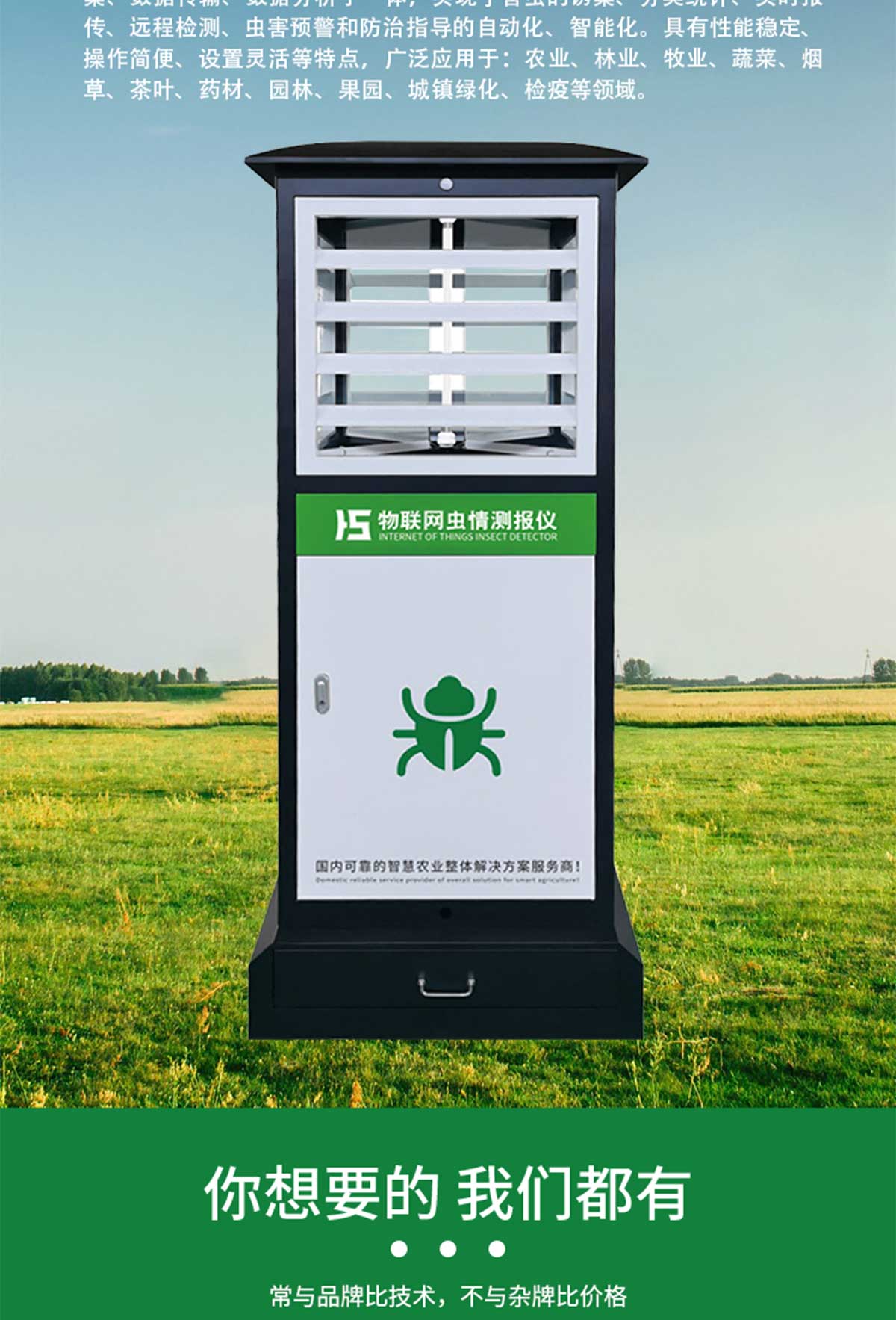冬眠式蟲情測(cè)報(bào)燈專為農(nóng)林蟲情測(cè)報(bào)而研制,該燈利用現(xiàn)代光、電、數(shù)控技術(shù),實(shí)現(xiàn)了蟲體冷凍自動(dòng)處理、整燈自動(dòng)運(yùn)行等功能。在無人監(jiān)管的情況下,能自動(dòng)完成誘蟲、蟲體冷凍、接冷凝水、拍照、稱重、掃蟲等系統(tǒng)作業(yè)??稍鲈O(shè)風(fēng)速風(fēng)向、環(huán)境溫濕度、光照等多種傳感器接口,并可通過4G/5G上傳數(shù)據(jù),以監(jiān)測(cè)環(huán)境與病蟲害之間的關(guān)系。廣泛應(yīng)用于農(nóng)業(yè)、林業(yè)、牧業(yè)、蔬菜、煙草、茶葉、藥材、園林、果園、城鎮(zhèn)綠化、檢疫等領(lǐng)域。