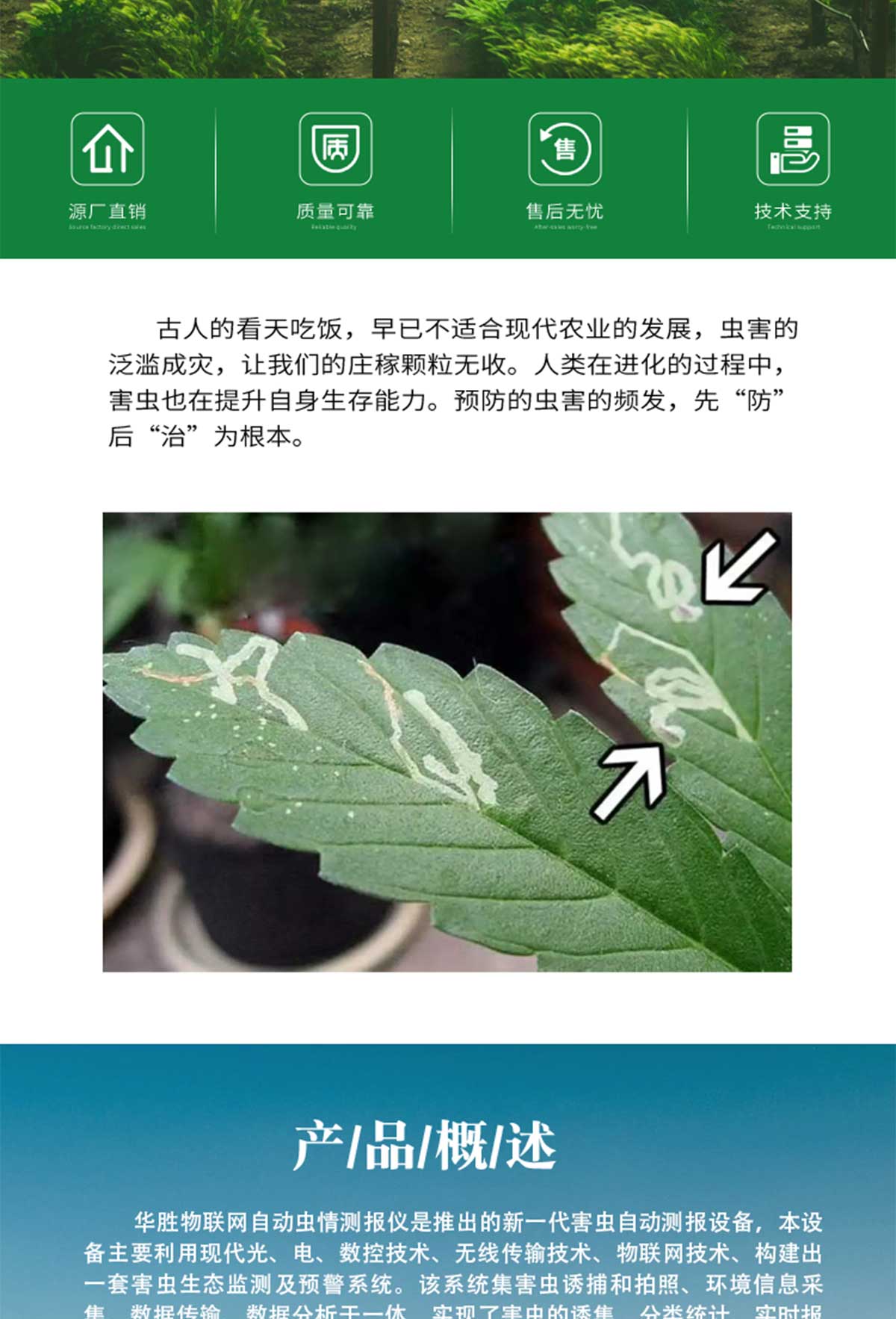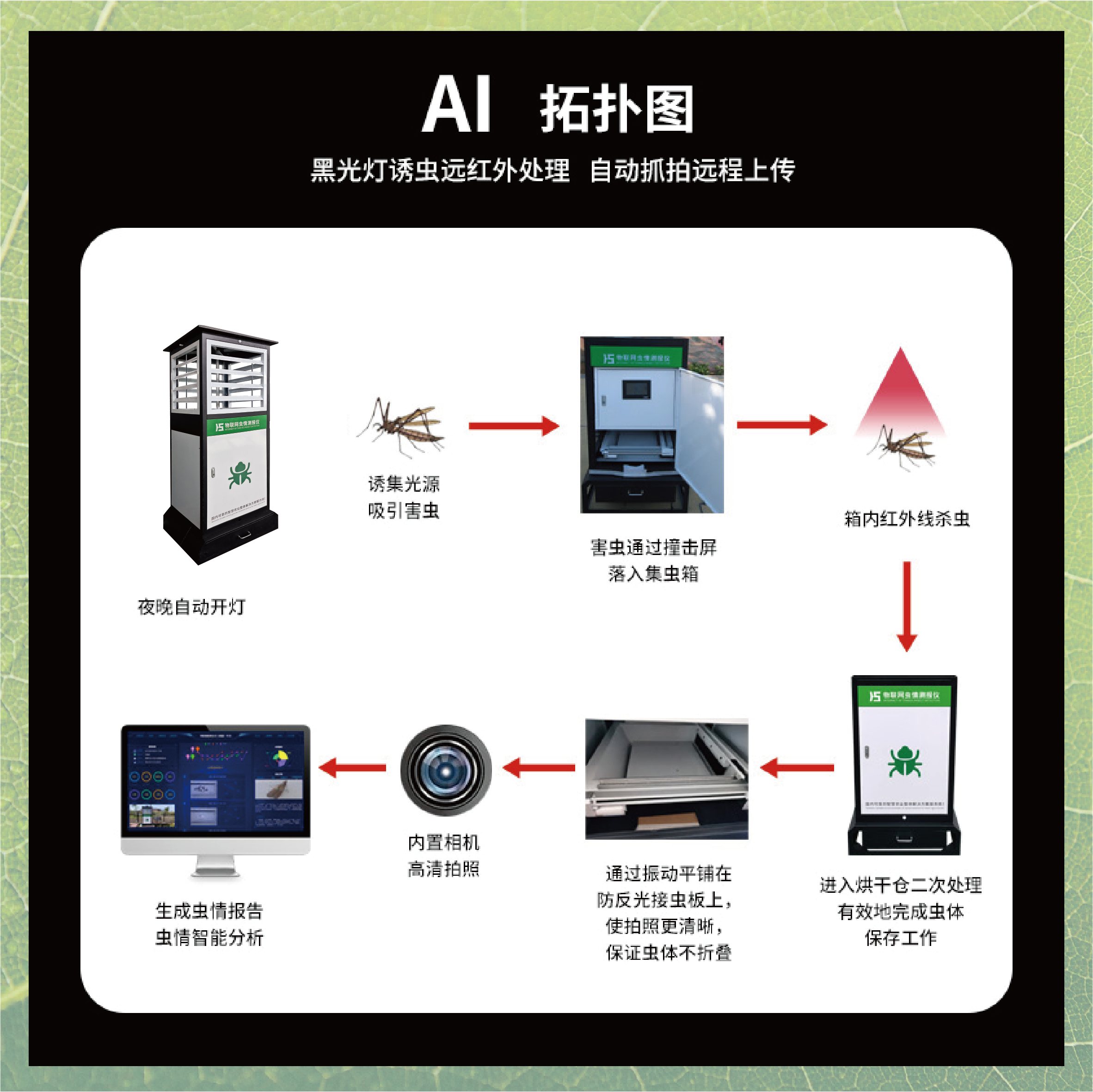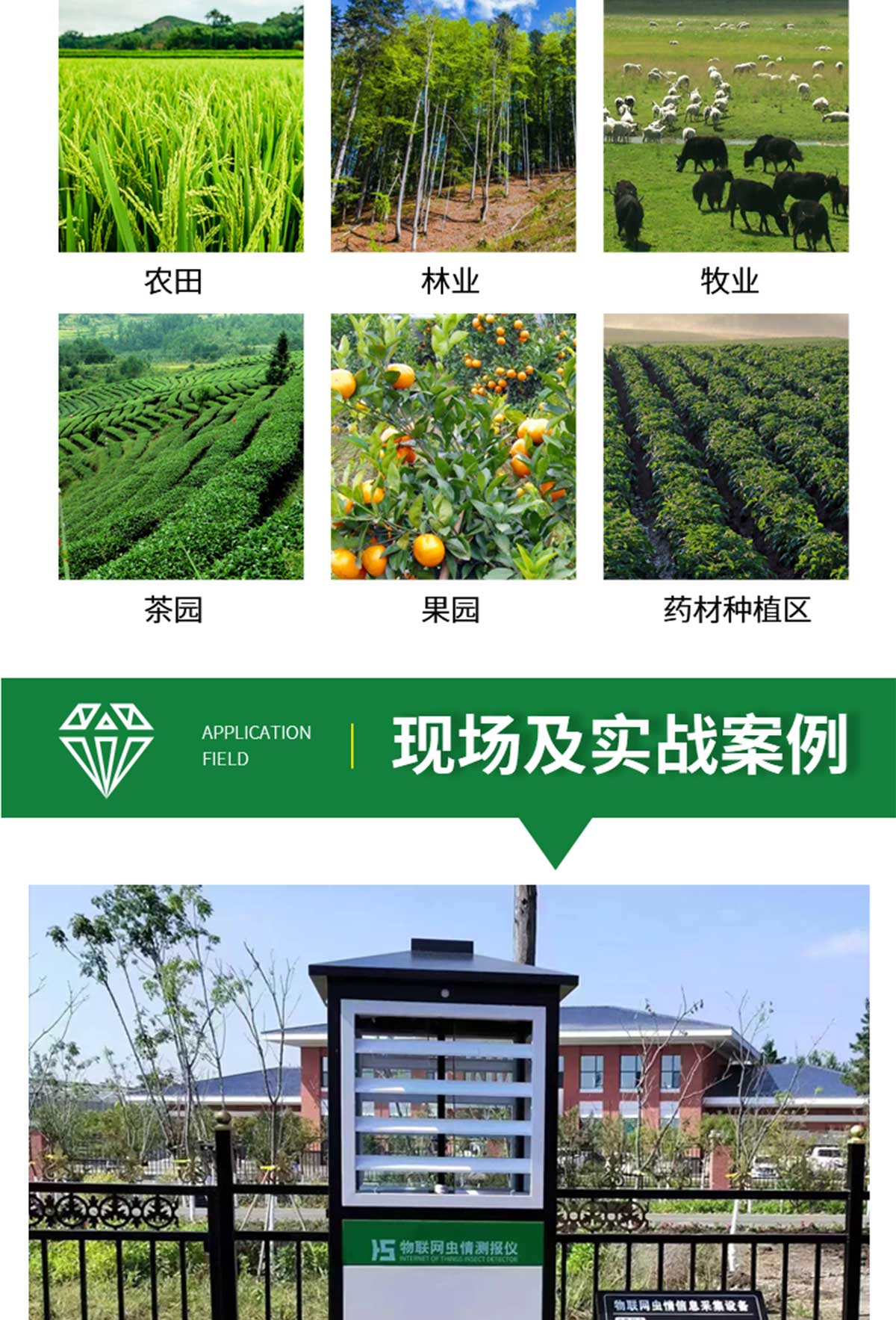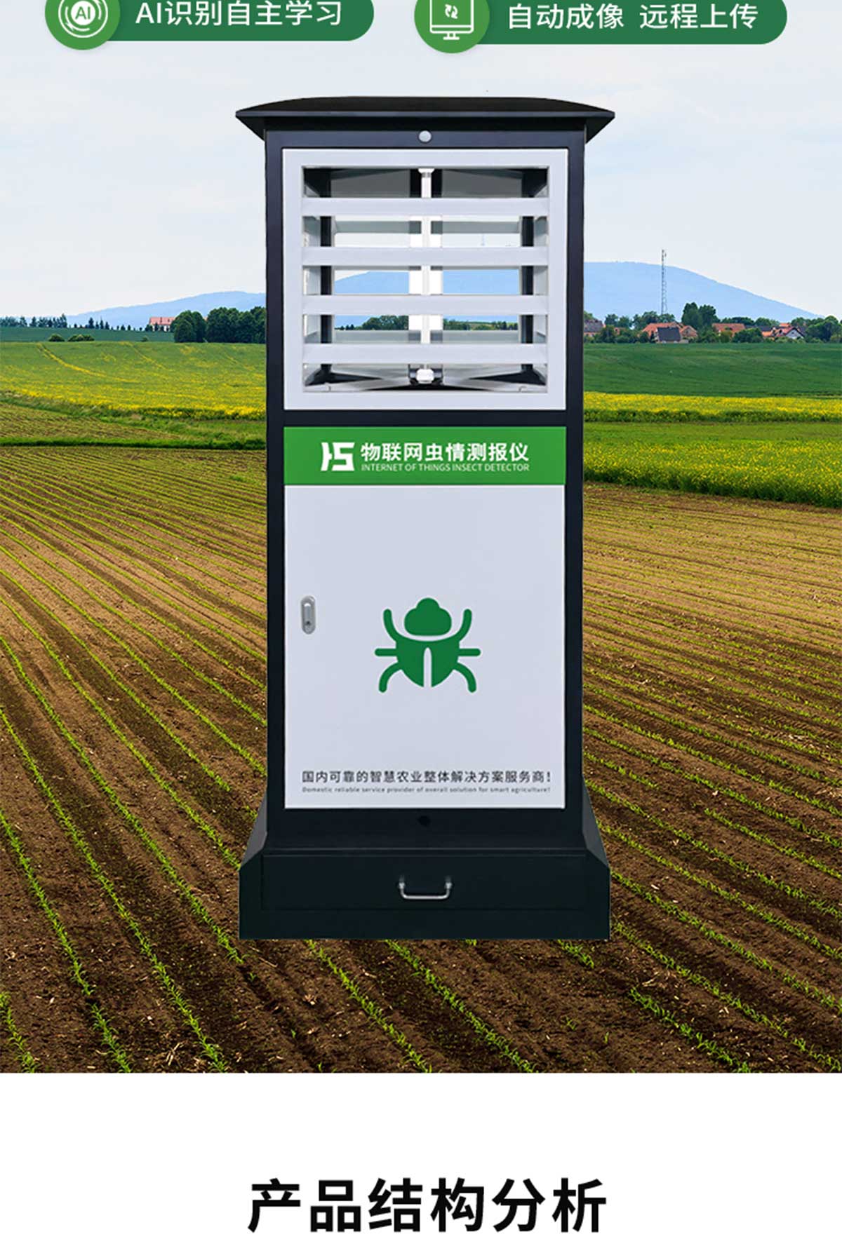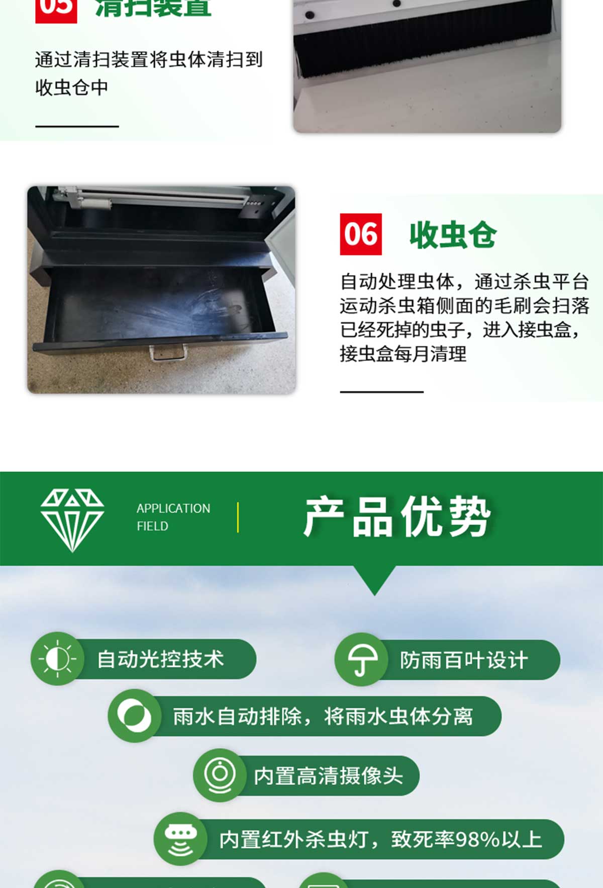 冬眠式蟲情測(cè)報(bào)燈專為農(nóng)林蟲情測(cè)報(bào)而研制,該燈利用現(xiàn)代光、電、數(shù)控技術(shù),實(shí)現(xiàn)了蟲體冷凍自動(dòng)處理、整燈自動(dòng)運(yùn)行等功能。在無人監(jiān)管的情況下,能自動(dòng)完成誘蟲、蟲體冷凍、接冷凝水、拍照、稱重、掃蟲等系統(tǒng)作業(yè)??稍鲈O(shè)風(fēng)速風(fēng)向、環(huán)境溫濕度、光照等多種傳感器接口,并可通過4G/5G上傳數(shù)據(jù),以監(jiān)測(cè)環(huán)境與病蟲害之間的關(guān)系。廣泛應(yīng)用于農(nóng)業(yè)、林業(yè)、牧業(yè)、蔬菜、煙草、茶葉、藥材、園林、果園、城鎮(zhèn)綠化、檢疫等領(lǐng)域。