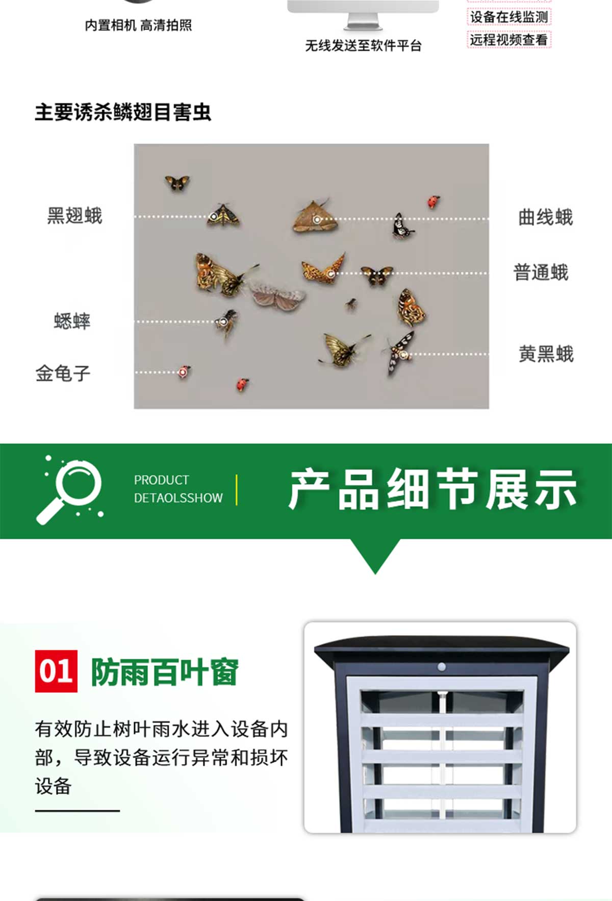 5、測(cè)報(bào)燈內(nèi)置1200W像素?cái)z像頭圖像采集設(shè)備,可通過攝像頭采集電子稱上的蟲子情況,所拍攝圖像清晰度能夠達(dá)到人工識(shí)別昆蟲種類的要求。