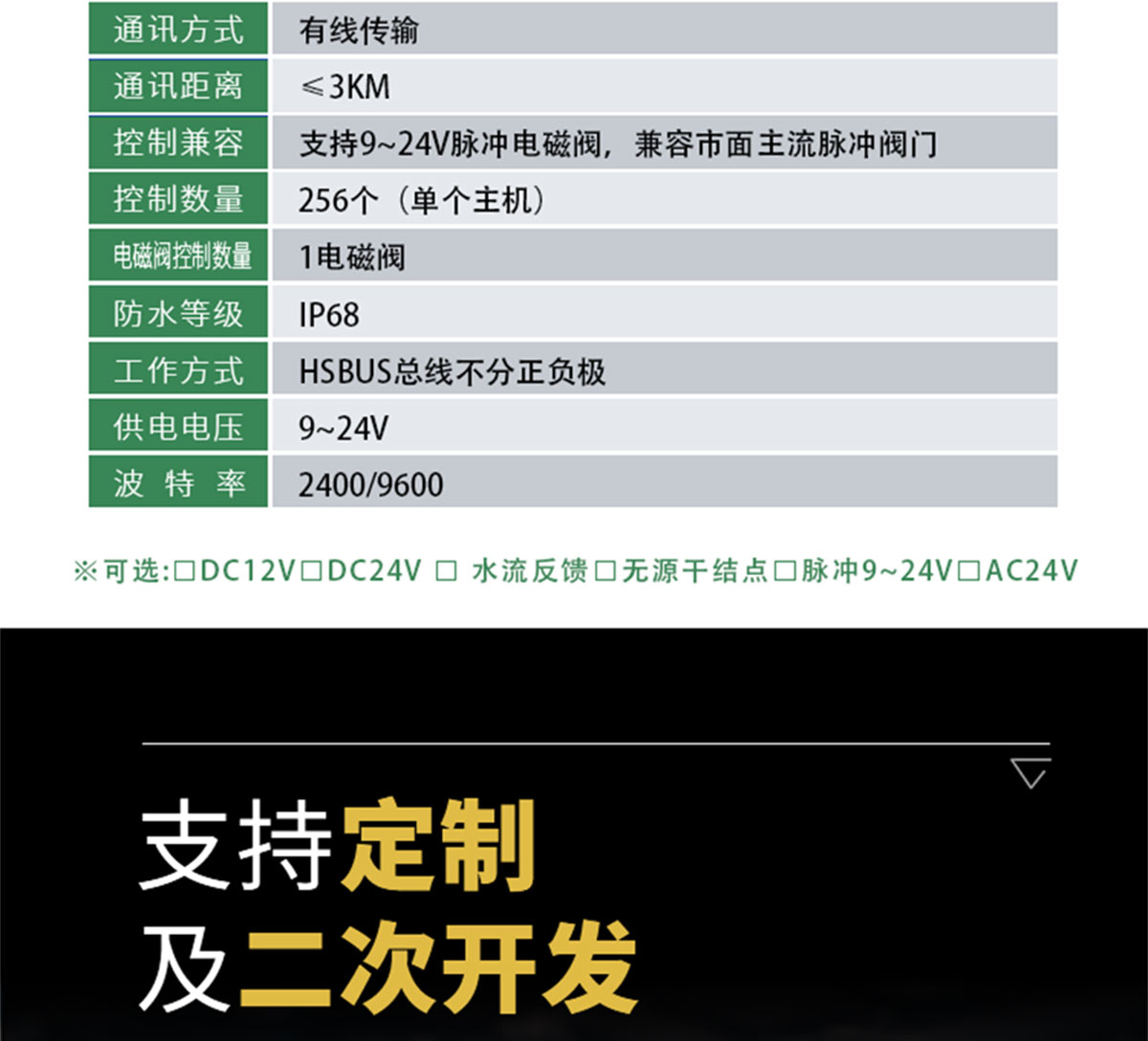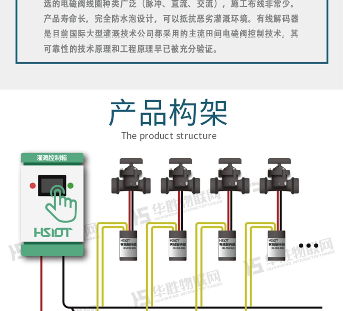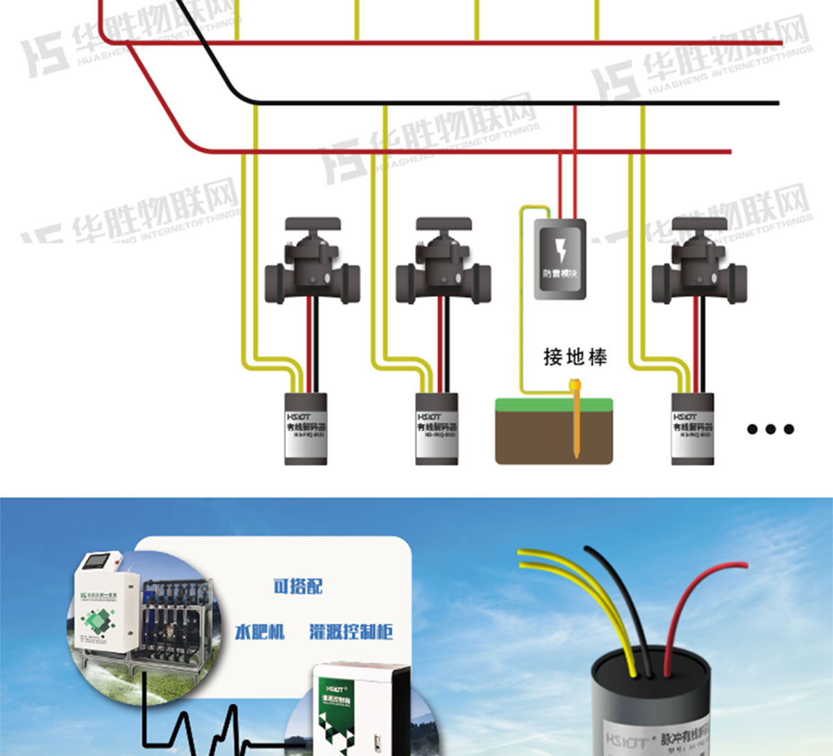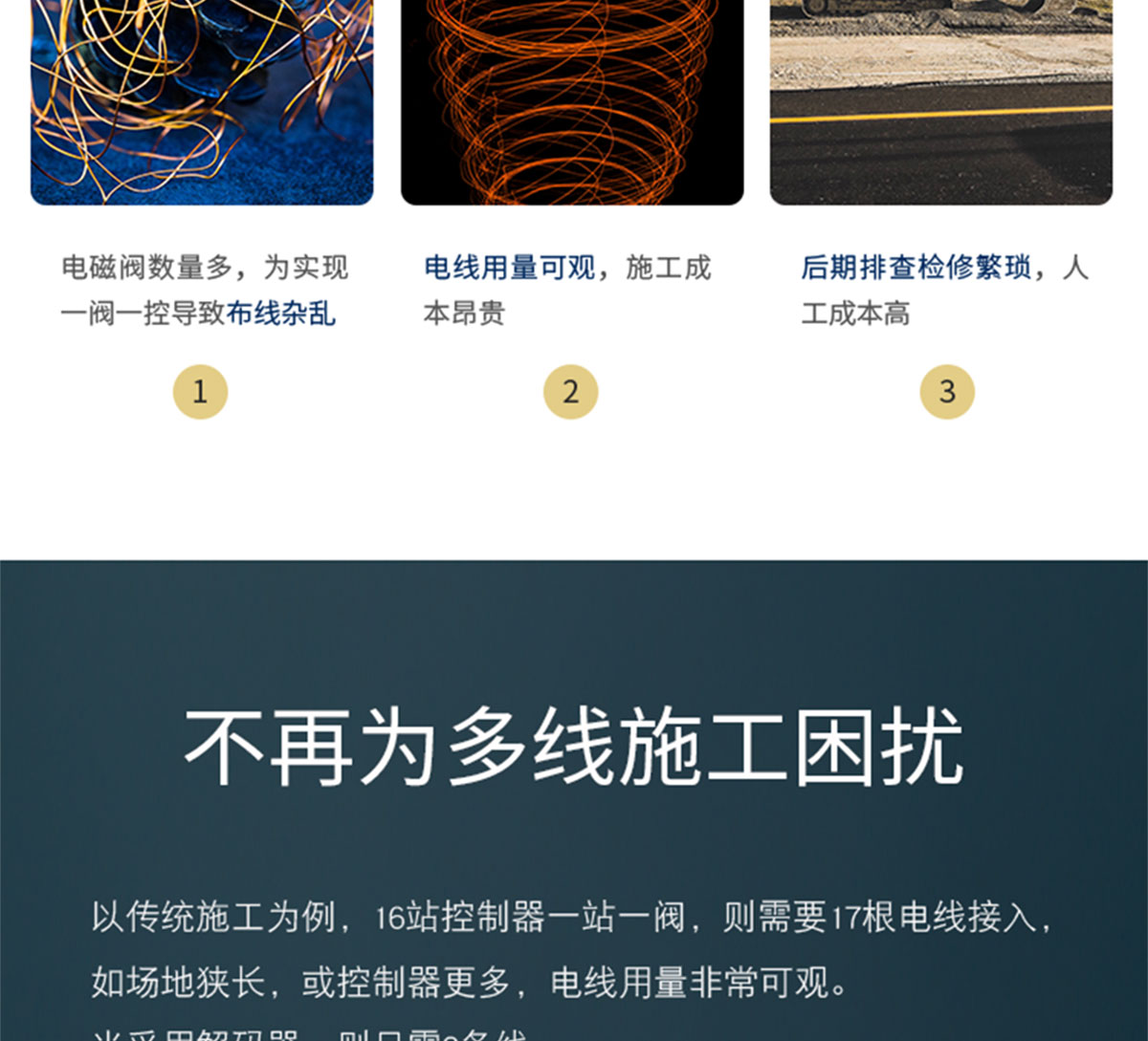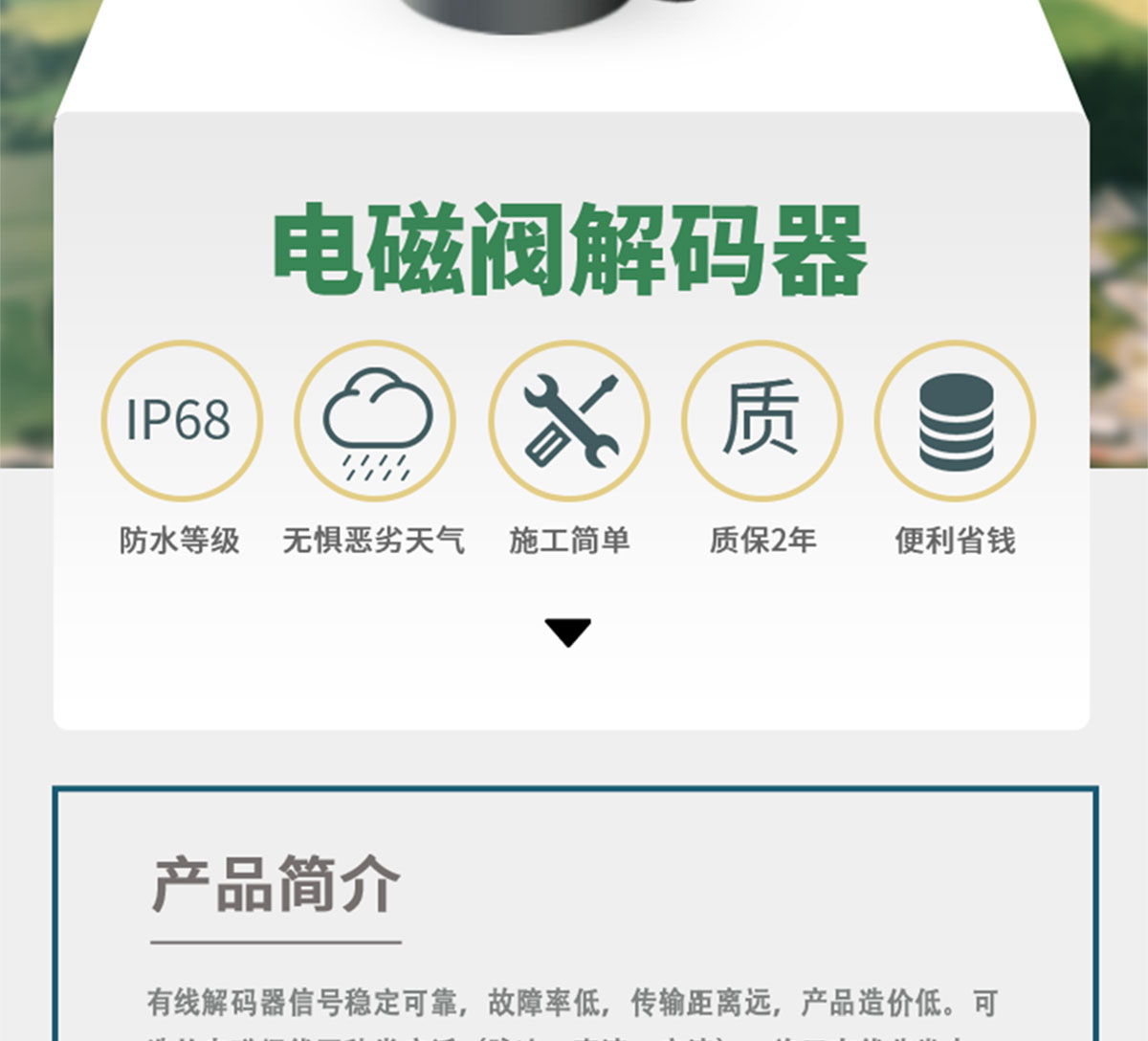 產(chǎn)品簡(jiǎn)介 : 有線解碼器信號(hào)穩(wěn)定可靠,故障率低,傳輸距離遠(yuǎn),產(chǎn)品造價(jià)低。支持的電磁閥線圈種類廣泛(脈沖,直流,自鎖,交流),施工布線非常少。產(chǎn)品壽命長(zhǎng),完全防水泡設(shè)計(jì),可以抵抗惡劣灌溉環(huán)境。有線解碼器是目前國(guó)際大型灌溉技術(shù)公司都采用的主流田間電磁閥控制技術(shù),其可靠性的技術(shù)原理和工程原理早已被充分驗(yàn)證。